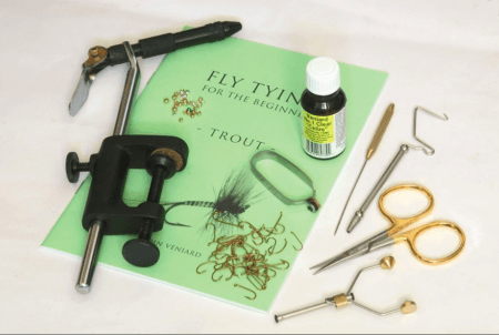 Fluguhnýtingasett frá Veniard með fluguhnýtingaþvingu, vönduðum verkfærum og miklu úrvali af góðu hnýtingaefni sem dugar í fjölmargar veiðnar flugur.